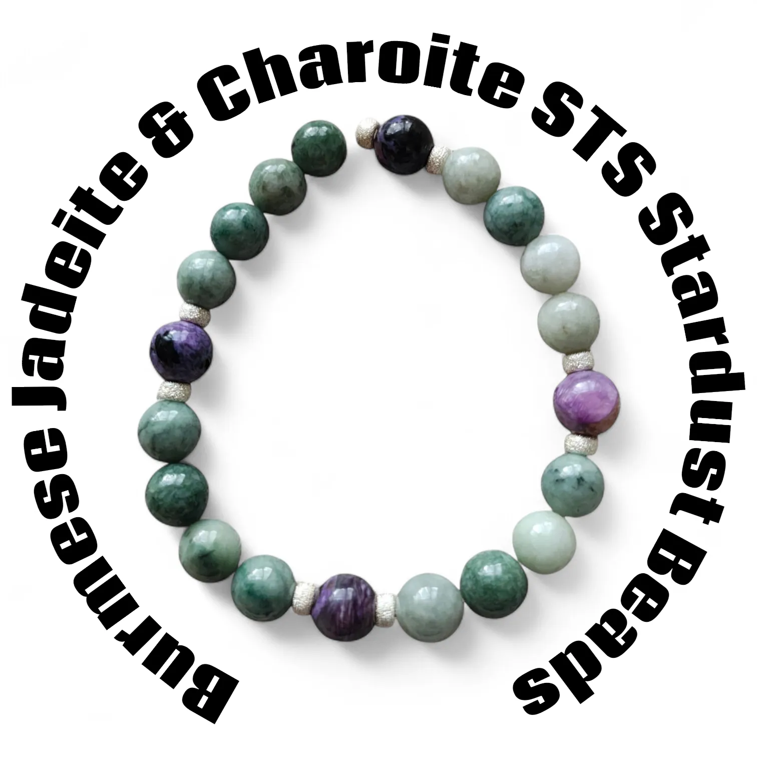 Burmese Jadeite and Charoite Stretchy Bracelet with Sterling Silver Stardust Spacer Beads