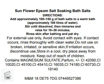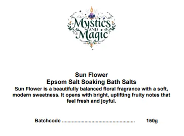 We have combined Epsom Salts with Sun Flower fragrance which is a beautifully balanced floral fragrance with a soft, modern sweetness. It opens with bright, uplifting fruity notes that feel fresh and joyful. As the scent develops, elegant floral tones bloom at the heart, softened by creamy sweetness that adds warmth and depth without overpowering. The base settles into smooth, comforting notes with a gentle lingering finish, leaving a long lasting fragrance that feels feminine, radiant and effortlessly wearable.