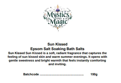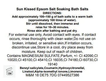 We have combined Epsom Salts with Sun Kissed fragrance which isiis a soft, radiant fragrance that captures the feeling of sun kissed skin and warm summer evenings. It opens with gentle sweetness and bright warmth that feels instantly comforting and inviting. As the scent develops, delicate florals blend with creamy notes, creating a smooth, elegant heart that feels feminine and relaxed. The base settles into warm vanilla, subtle musk and lingering softness, leaving a long lasting fragrance that feels cosy, glowing and effortlessly wearable.