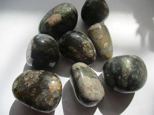 A que sera tumblestone is a small, polished piece of que sera stone that has been shaped and smoothed through a process of tumbling. Que sera stone is a type of jasper that is found in Brazil and typically has a mixture of colours, including pink, green, and yellow.